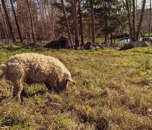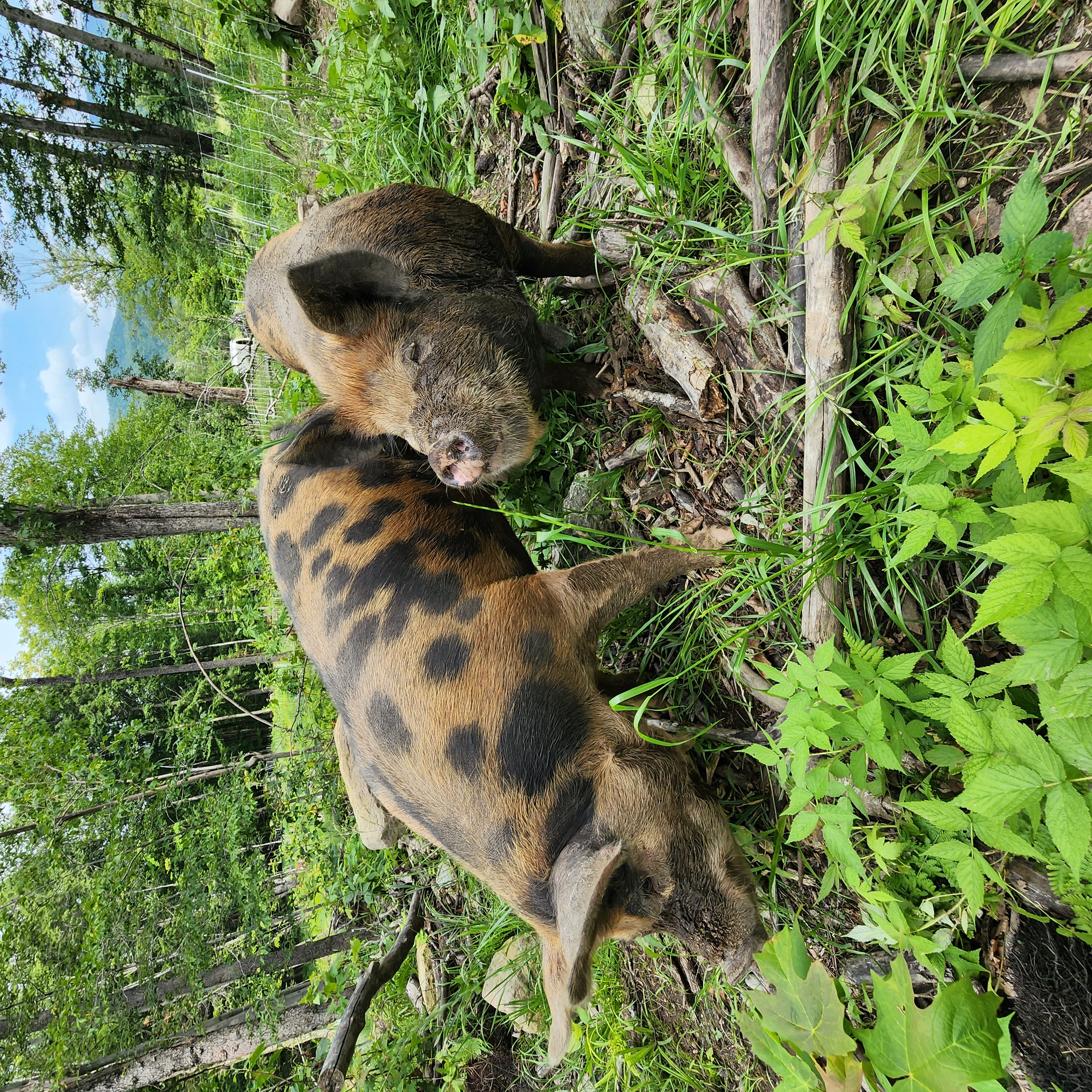 Our farm is home to a cross of two fantastic pig breeds: the Hungarian Mangalitsa and the Idaho Pasture Pig.